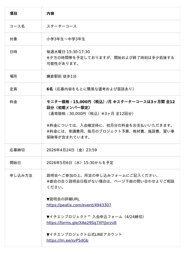 「好きなことで稼ぐ」をリアルに体験する起業教育プログラム「イチエンプロジェクト(TM)︎」2026年5月6日より鎌倉駅前(徒歩1分)にて開講!小・中学生を対象に、鎌倉で仲間と一緒にプロジェクトを進め、思いを形にします。申し込みは4月1日~4月24日まで!現在モニター募集中!