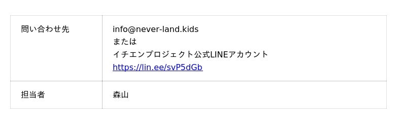 プログラムの運営サポートや、屋外活動のサポート、そのほかイチエンプロジェクトを運営していく上でのサポートを行ってくださるボランティアを、週2時間から募集しております。関わりたい方は、以下の連絡先までお問い合わせください。