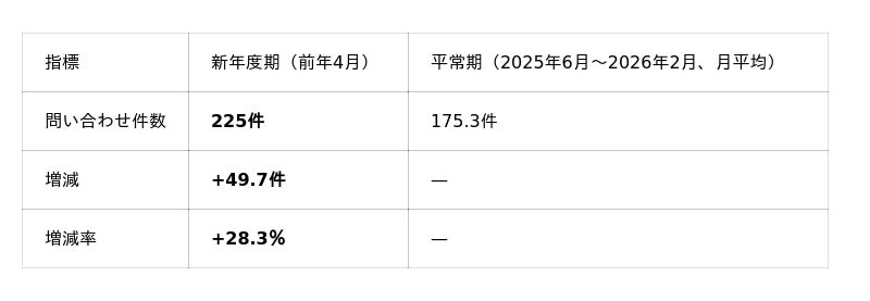 新年度期(前年4月)の問い合わせは225件となり、平常期(月平均175.3件)比で約28%増加しました。