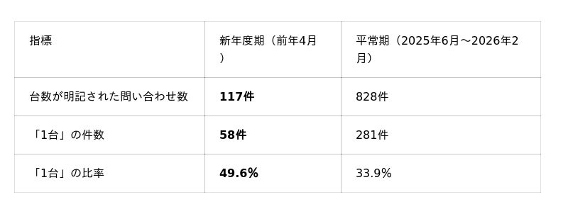 その結果、新年度期は問い合わせが増加し、台数が明記された相談では「1台追加」が約5割を占めるなど、新年度ならではの相談傾向が見られました。