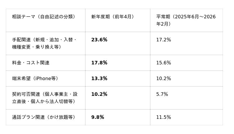 自由記述でも手配・コスト・端末・契約可否の確認が平常期より増え、新年度は急ぎの中で「いつから使えるか」「総額」「手続きの流れ」まで一度に確認したい相談が多く寄せられています。
