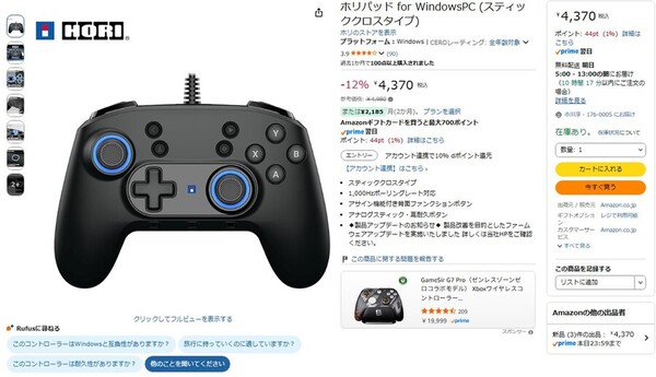 Amazon.co.jpにて、「ホリパッド for WindowsPC (スティッククロスタイプ)」が販売中だ。参考価格は4980円だが、執筆時点では12%オフの4370円で購入できる(4月9日時点)。