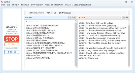 本アプリは、診察室における医師と外国語話者の患者間のコミュニケーションを、リアルタイムの同時翻訳によって支援する診療支援AIです。今までのカルステップ同様、診察後には自動的にカルテ記事が完成し、必要に応じて外国語の紹介状も作成します。