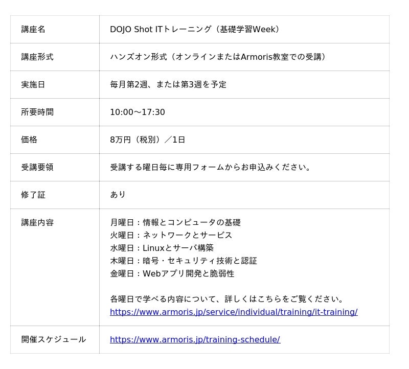 株式会社Armoris (本社:東京都台東区、代表取締役社長:坂井和則、以下Armoris)は、2026年4月1日、「DOJO Shot ITトレーニング(基礎学習Week)」(以下「本サービス」)をリリースしました。本サービスは、ITを活用するすべてのビジネスパーソンから、セキュリティ・開発・運用担当者の学び直しにまで幅広く活用いただけます。現在の高校教育で必修となっている「情報I」の履修範囲をベースに、Armorisメンバーが実務で得た経験や高度なスキル、最新のIT動向を取り込んだ、ビジネスの現場で求められる実戦的なセキュリティ学習プログラムです。