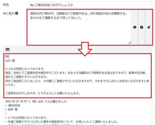現段階では、すべてのメール業務を自動化するものではありませんが、今後の開発が進むことで、メール作成にかかる負担をさらに軽減し、ビジネスコミュニケーションをより円滑にするための機能へと進化させていく予定です。