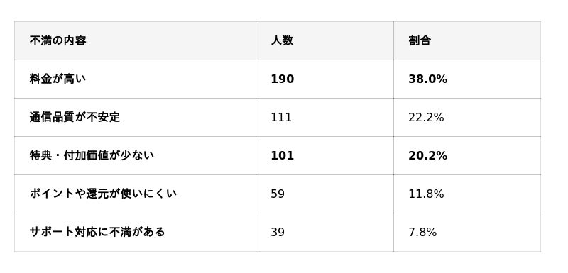 「料金が高い」が38.0%で最大の不満だが、注目すべきは「特典・付加価値が少ない」が20.2%で3位に入っている点だ。料金だけでなく付加価値を通信サービスに求める消費者が一定数存在することを示している。