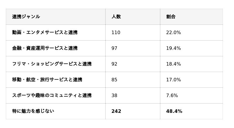 「特に魅力を感じない」が48.4%で最多であり、異業種連携型の通信サービスはまだ消費者に広く浸透していない。関心がある層では「動画・エンタメ」22.0%が最多で、「移動・航空・旅行」17.0%は4位だが、上位との差は5ポイント以内であり、認知が広がれば伸びる余地がある。