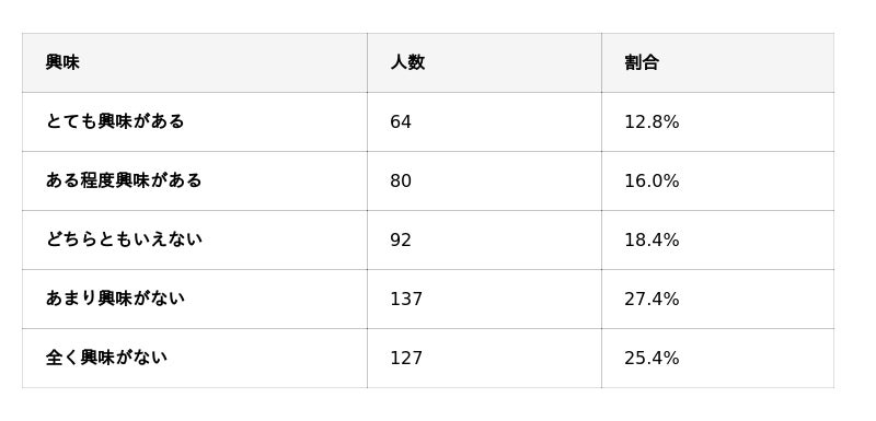 全体では「興味がある」計28.8%に対し「興味がない」計52.8%。一般消費者全体で見ると関心は限定的だが、後述する航空利用者に限定した分析では大きく異なる結果となる。