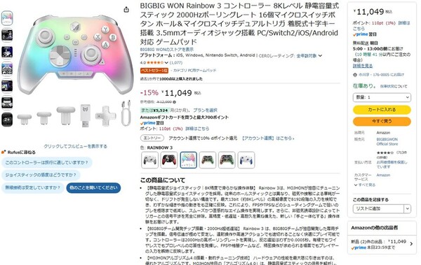 Amazon.co.jpにて、PC・Switch2・iOS・Androidに対応するコントローラー「BIGBIG WON Rainbow 3」が販売中だ。参考価格は1万2999円だが、執筆時点では15%オフの1万1049円で購入できる(4月9日時点)。