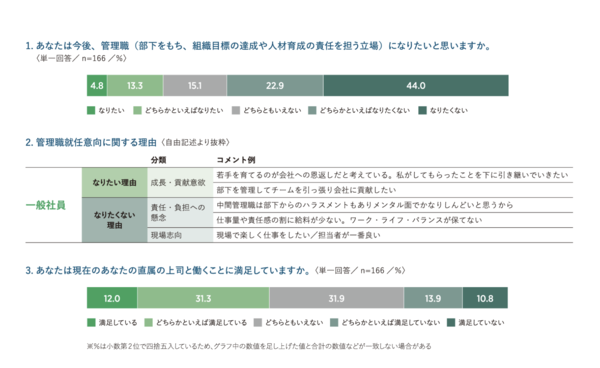 一方、一般社員においては、責任の重さや業務負荷、ワーク・ライフ・バランスへの不安などを背景に、管理職志向が高まりにくい状況が示されています。ただし、上司に対する満足度が高い社員ほど、管理職を前向きに捉える傾向も確認されました。