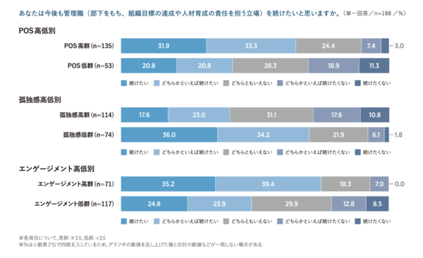 さらに、管理職の継続意向は、組織からの支援実感(POS: Perceived Organizational Support)や職場での孤独感、エンゲージメントの高さと関連しているとされています。支援を感じ、孤立していない管理職ほど、継続意向が高い傾向がみられます。
