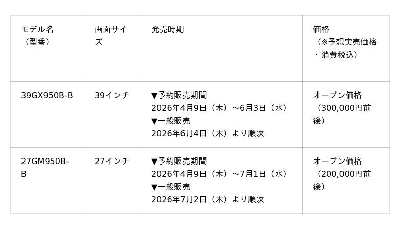 LGエレクトロニクス・ジャパン株式会社(代表取締役:孫 成周(ソン・ソンジュウ) 本社:東京都中央区)は、5K以上の超高解像度かつ、AIソリューションを搭載したゲーミングモニター新シリーズ「LG UltraGear(TM) evo AI」において、同シリーズ最初の国内販売モデルとして、39インチ5K2K解像度有機ELゲーミングモニター「39GX950B-B」と、27インチ5K解像度Hyper Mini LED採用ゲーミングモニター「27GM950B-B」の発売を決定し、本日2026年4月9日(木)より予約販売を開始します。