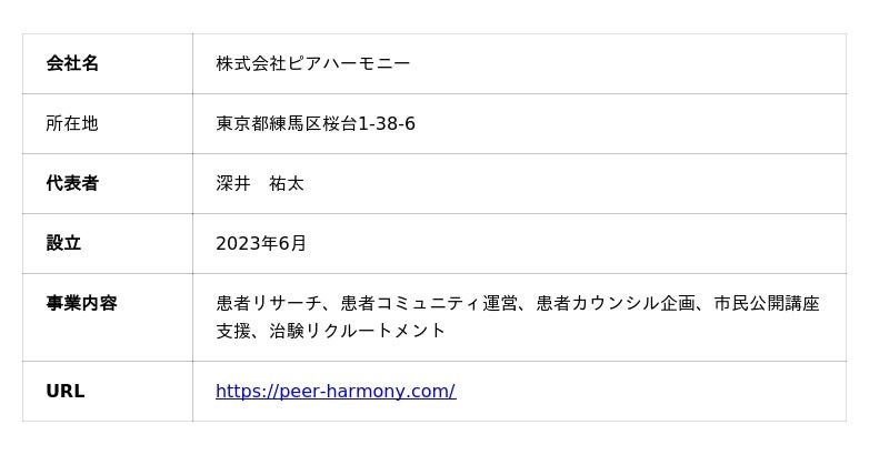 株式会社ピアハーモニーピアハーモニーは、「患者の声を医療者・製薬会社に届ける」ことをミッションに、希少疾病・難病領域に特化した患者リサーチ・コミュニティ運営を行う企業です。70以上の患者団体との連携体制を持ち、年間200件以上の患者インタビューを実施。患者との継続的な信頼関係を基盤に、患者カウンシルの企画運営、市民公開講座の支援、定量調査、治験リクルートメント等を手がけています。