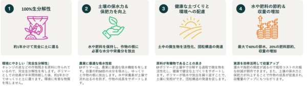 こうした課題に対するアプローチのひとつが、沖縄科学技術大学院大学発スタートアップのEF Polymer株式会社が開発する「EFポリマー」だ。果物の皮などの作物残渣からつくるポリマーで、土に混ぜると水を吸って保持する性質を持つ。イメージとしては、土の中にスポンジを仕込むようなものだ。
