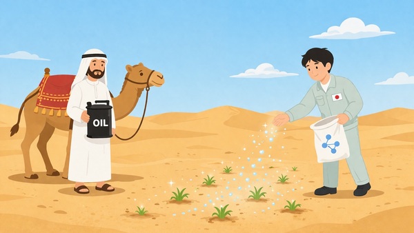 かつては中東から運ばれてきた石油からポリマーをつくっていたが、いまは日本が生み出した植物由来のポリマーを中東の農業で使おうとしている。そうしたやり取りが積み重なり、水や食料の問題が和らいでいけば、地域の安定にもつながっていく。遠回りに見えるが、こうした技術交流の積み重ねが、結果的に平和に近づく一歩になるのかもしれない。