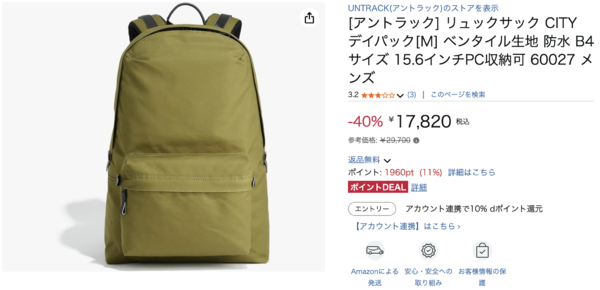 UNTRACKのCITY デイパック[M] ベンタイル生地が、Amazonで40%OFFの17,820円で販売されています。