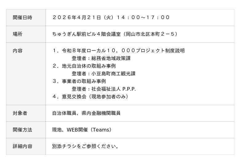10,000プロジェクトセミナー」を開催いたします。本セミナーは、当行が自治体および岡山県内に本店を置く金融機関と連携し、地域が一体となって地域課題の解決を図ることを目的としています。 制度の概要説明や「ローカル10,000プロジェクト」を活用した具体的な事例紹介を通じて、制度への理解を深める内容となっています。