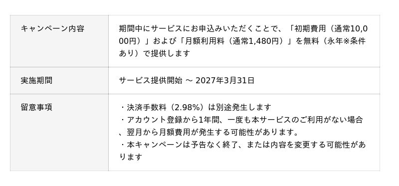 また、サービスリリースを記念して「初期費用・月額費用0円宣言キャンペーン」を実施します。キャンペーン期間中にお申込みいただくことで、通常発生する初期手数料10,000円および月額費用1,480円が永年無料※になります。