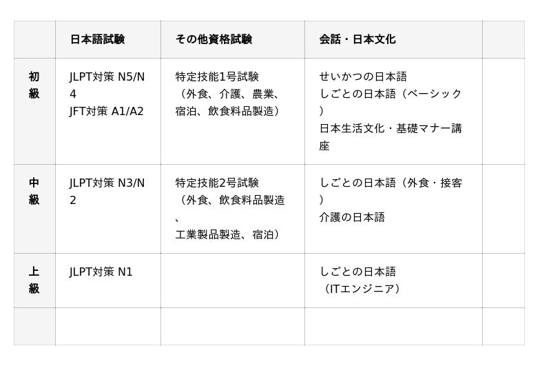 技能実習ビザや特定技能ビザで入国した外国人材が日本での生活・仕事に馴染み、長期的に活躍できるようワンストップで学習をサポートします。円滑な就業のための日本語会話講座や日本文化マナー講座に加えて、ビザ切り替えのために必要な日本語能力試験や特定技能2号の試験対策講座を提供しています。