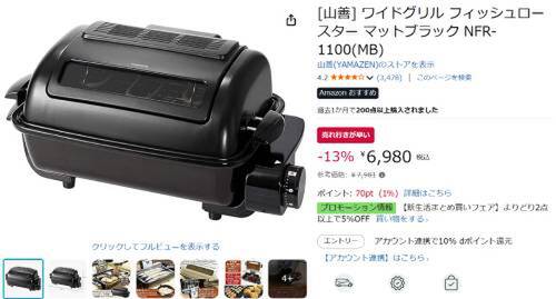 山善の「ワイドグリル フィッシュロースター NFR-1100(MB)」がAmazonで割引対象。参考価格7,981円のところ、13%オフの6,980円で販売中。