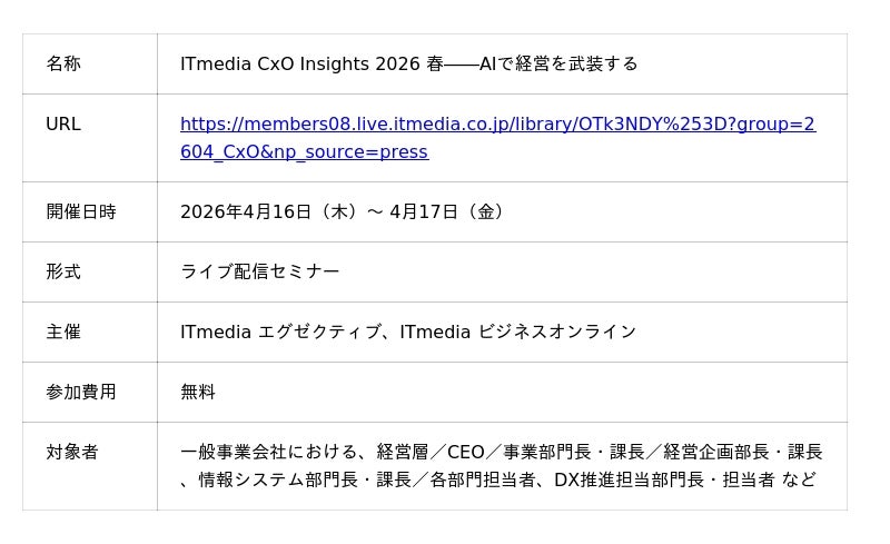 アイティメディア株式会社(本社:東京都千代田区、代表取締役社長 兼 CEO:小林教至、以下アイティメディア)は、2026年4月16日(木)~ 4月17日(金)に「ITmedia CxO Insights 2026 春」を開催します。本イベントは「ITmedia エグゼクティブ」「ITmedia ビジネスオンライン」主催のデジタルイベントで、「AIで経営を武装する」をコンセプトとしています。「総合的なセキュリティ対策」「AI×経営」「データドリブン経営」の3つのテーマに合わせた講演・セッションを通じて、企業の経営課題を解決するヒントをお届けします。
