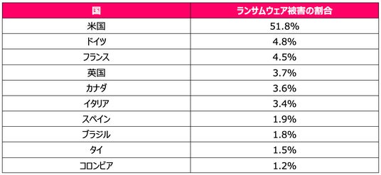 国別では米国が最も多くの被害を受け、ランサムウェア被害の51.8%を占めました。次いでドイツ(4.8%)、フランス(4.5%)、英国(3.7%)と続いています。ランサムウェア攻撃は特に北米への集中が顕著であるものの、被害上位国は北米、ヨーロッパ、アジア、ラテンアメリカなど複数の大陸に分布しており、攻撃が集中する地域がある一方で、ランサムウェアが依然として世界的な脅威であることが示されています。