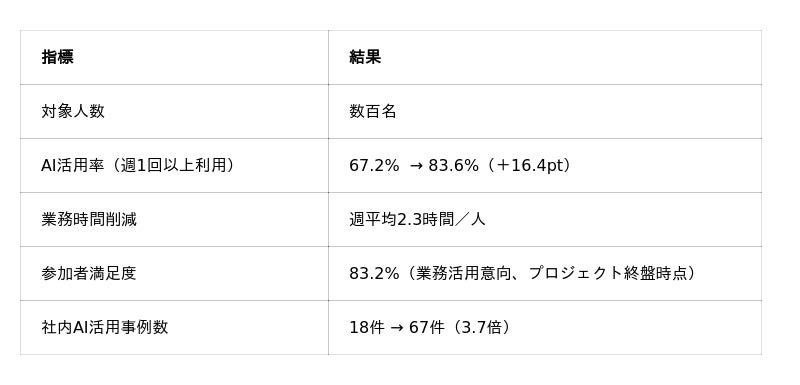 本プログラムは東証グロース上場企業にて導入され、AI活用率の67.2%から83.6%へ向上、実務における週2.3時間の時間創出、現場でのAI活用ノウハウの循環などの成果をあげました。