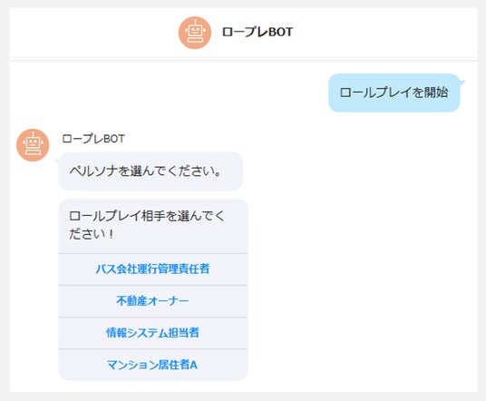 普段利用している社内チャットツールでBotをチャットルームに追加し、メニューから「ロールプレイを開始」を選ぶだけで簡単に利用可能です。