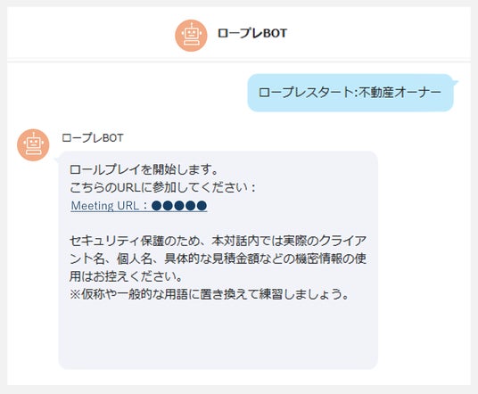 当社の実際の事業内容に最適化された相手役(ペルソナ)を複数用意しており、運用を通じた継続的な改善・アップデートが可能です。チャット上でペルソナを選択し、発行されたオンラインMTGのURLから参加するだけで、AIとのリアルタイムな音声対話が行えます。