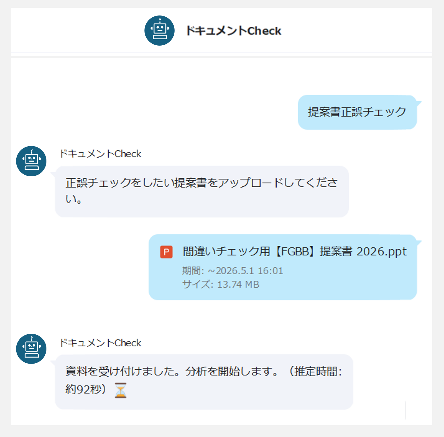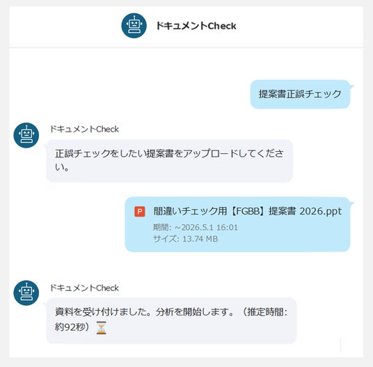 資料を送信後、分析が完了次第トークルームに結果が自動で返信されます。手軽な自己レビューとして活用でき、人の目による最終チェック前の段階で資料の質を高めることで、業務効率の大幅な向上に貢献します。