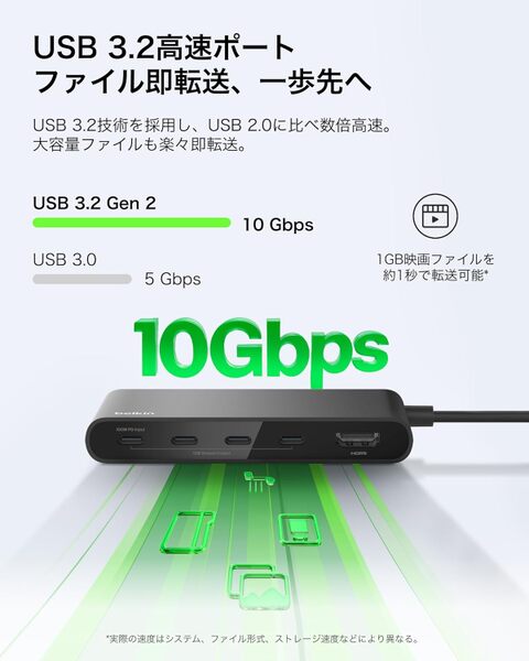 Belkin Connect USB-C ハブ 5-in-1 AVC021fqBKは、USB-Cポートを複数備えている点が特徴。周辺機器の接続はもちろん、充電やデータ転送を同時に行える設計になっています。最大10Gbpsの高速データ転送にも対応しており、外付けSSDや大容量データのやり取りもスムーズ。