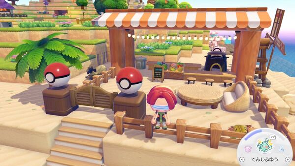 海の家っぽいオープンカフェ。モンスターボールのオブジェが良い