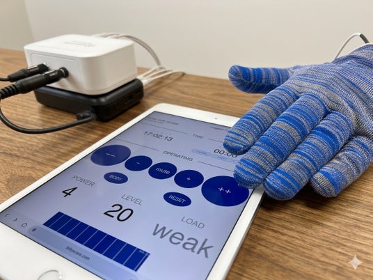 2. 【高齢者への安全性】専用ジェル不要・水だけで完結。デリケートな肌にも優しく 一般的な通電機器に必要な冷たい専用ジェルやクリームは一切使用しません。グローブに「水」を含ませるだけで施術が可能です。拭き取りの手間が省けるため、ベッド上でのケアや訪問先でもシーツや衣服を汚す心配がありません。また、強い摩擦が起きないため、皮膚剥離のリスクを抑え、安全にケアを行えます。