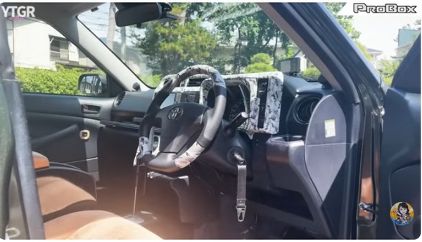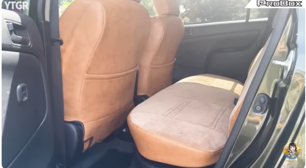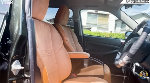 シートは運転しやすい姿勢でゆったり座れる3D成型バケットシートカバー使用し、長距離運転でも耐えられる仕様になっています。表皮はコーデュロイとヴィンテージキャメルレザーを組み合わせたもので、とてもプロボックスには見えません。