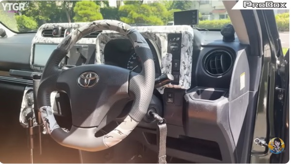 車内は純正パーツをすべて取り外し、フィルム転写したものを再度装着してあります。フィルム次第でウッドやマット仕様など、好みのデザインに替えることが可能です。