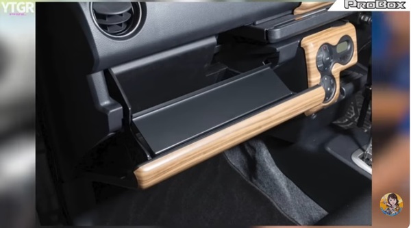 助手席側のダッシュボックスの隙間を埋めて、机のようにしてくれるトレイ(プロボックス用グローブボックストレイ 4950円)を装着し、利便性も向上。