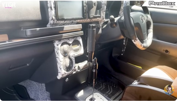 プロボックスにはセンターコンソールがないので、2段開閉式のセンターコンソールを後付けしています。色もコーデュロイとヴィンテージキャメルレザーで合わせ、車内に統一感が生まれています。