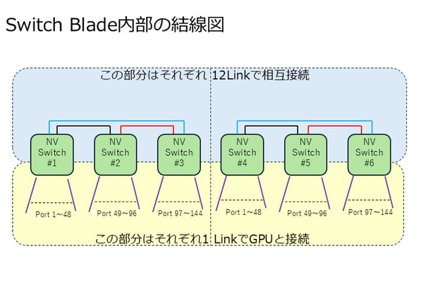 さて、そうなるとSwitch Blade内部(Switch Bladeの写真でカバーが隠れている部分)はどうなっているのか? だが、3つのNVSwitchを組み合わせて144ポートのスイッチを構築するという下図のような構成になっているものと考えられる。2つの基板の間をさらに大量の配線で相互接続することは不可能ではないと思うが、そこまでやる必要もなさそうだからだ。
