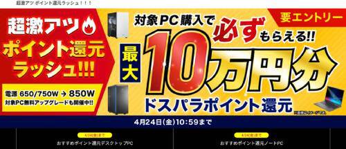 ドスパラでは現在、「ポイント還元ラッシュ」キャンペーンを実施中。対象PCを購入すると、モデルごとにポイントが還元される。