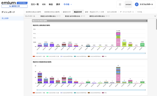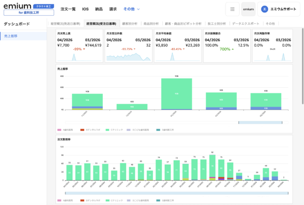 エミウム株式会社は4月8日に、歯科技工基幹業務クラウド「エミウム クラウド技工」の経営ダッシュボード機能のアップデートを発表した。月次売上高・受注件数・平均単価・再製作率・保険割合といったKPI(重要業績評価指標)の可視化や、顧客別分析、技工物別分析、技工士別分析、ピボット分析など、歯科技工所経営に特化した経営分析機能を搭載し強化。歯科技工所や院内技工所の経営者が、勘や経験に頼らない「データドリブン経営」を実践できる環境を提供するとしている。