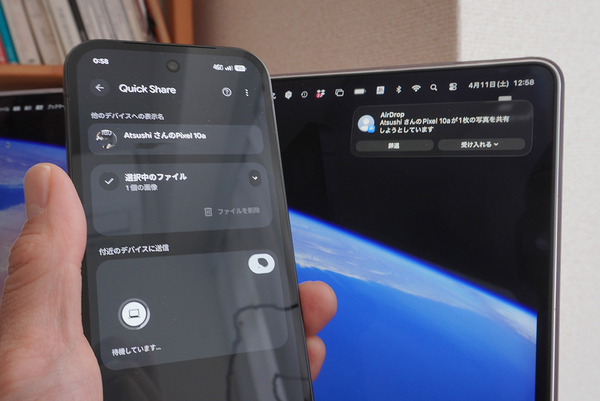 Pixel 10シリーズの末弟となるPixel 10aも、このAirDrop互換のQuick Share機能に対応します。筆者は、Pixelスマホで撮影した写真や動画を素速くMacに転送できるようになったことが、毎日の仕事にも役立っています。