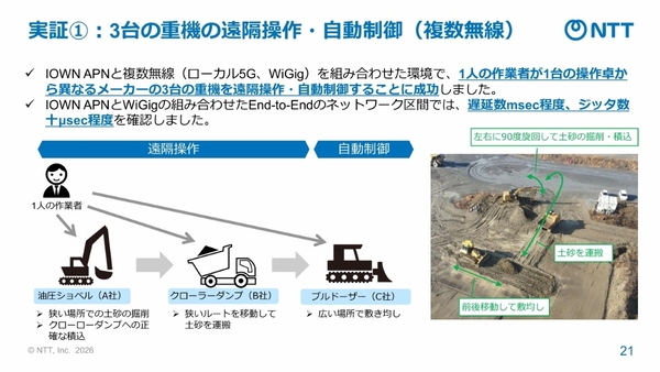 重機3台の遠隔施工をオペレーター1名で NTTと大成建設がIOWNדローカル5G/WiGigの使い分け”で実現