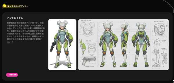 OiiOiiは以下の6つのエージェントに分かれて作業を順次実施していきます。必要なエージェントは作業段階に合わせてチャット欄に登場し、対話を進めて詳細を決めていけます。アートディレクターと、アートスタイルや基本のキャラクター設定を設定後、脚本家がストーリーを作り出し、キャラクターデザイナーがキャラクターの三面図を起こしていきます。