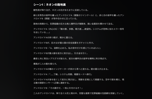 完成した動画では、バディを組む二人のアンドロイドが、路地裏で敵ロボットに囲まれている状態から、反撃して脱出するまでが描かれています。