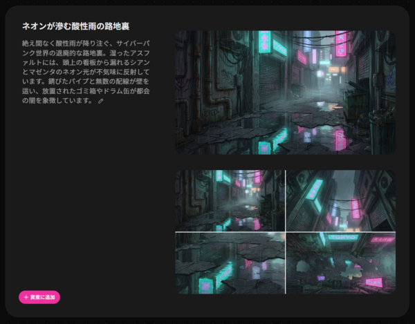 筆者は、「2人のアンドロイドがチームを組んで、サイバーパンクの都市で犯罪組織と戦う物語を作って」と指示しました。作成できる動画のサイズは16:9か、9:16のみです。