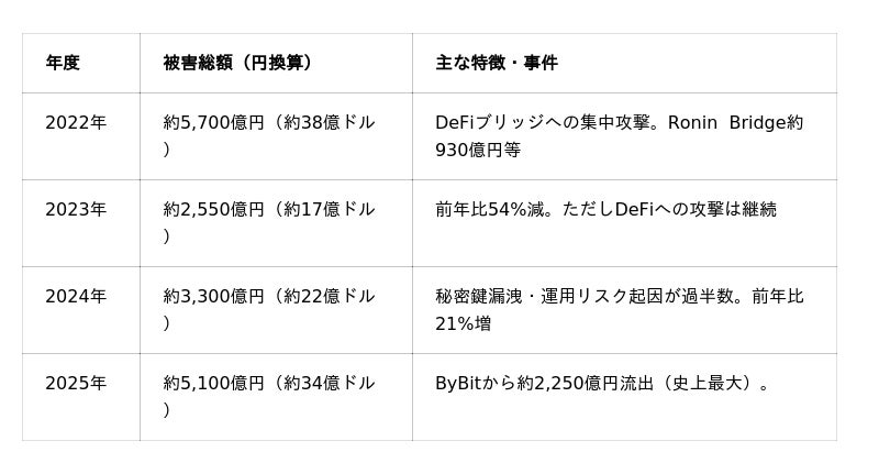 ・ 2025年、暗号資産ハッキング被害は年間約5,100億円(約34億ドル)に達し、史上最大のByBit事件(約2,250億円)が発生