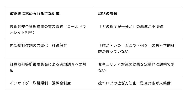 - 金商法対応への活用:技術的安全管理措置の実装証跡・監査ログとしての有用性、規制当局報告への活用可能性