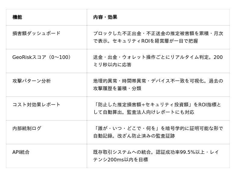 しかし、取引所や決済事業者の経営層にとって、その投資効果はこれまで数字で見えませんでした。GeoRiskの損害額ダッシュボードはこの構造的課題を解決します。同時に、2026年の金商法改正が求める内部統制強化に、技術面と証跡面の両方から応えるソリューションです。