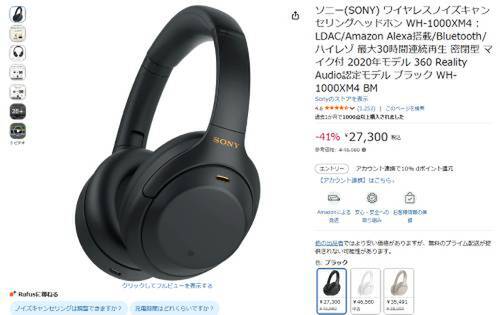 ソニーのワイヤレスノイズキャンセリングヘッドホン「WH-1000XM4」がAmazonで割引対象。参考価格45,980円のところ、41%オフの27,300円で販売中。