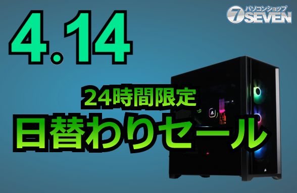 セブンアールジャパンが運営するパソコンショップSEVENは、4月14日に「2026/4/14 24時間限定セール」を開催する。セールは0:00から23:59までの24時間限定で、最新のゲーミングPCやデスクトップPCが最大90,000円オフになる特別企画となっている。